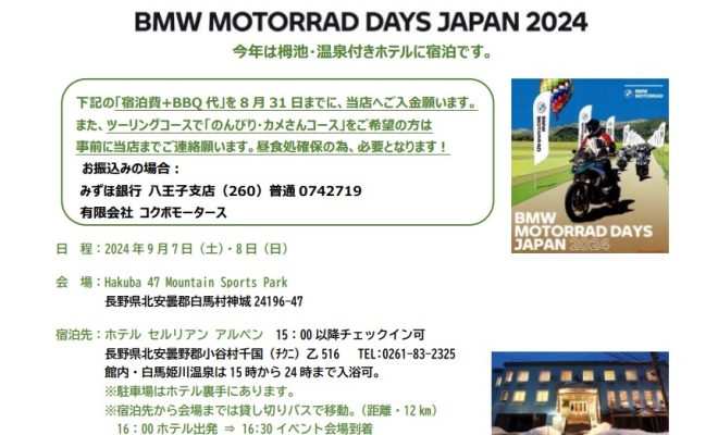 BMW MOTORRAD DAYS JAPAN 2024 のお知らせ今年は栂池・温泉付きホ…