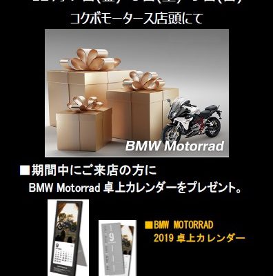 BMW MOTORRAD クリスマスフェアー のお知らせ。 12月7日(金)・8日(土)・9日(日) コクボモータース店頭にて。 ご来店の方に『BMW MOTORRAD 卓上カレンダー』をプレゼント。 …