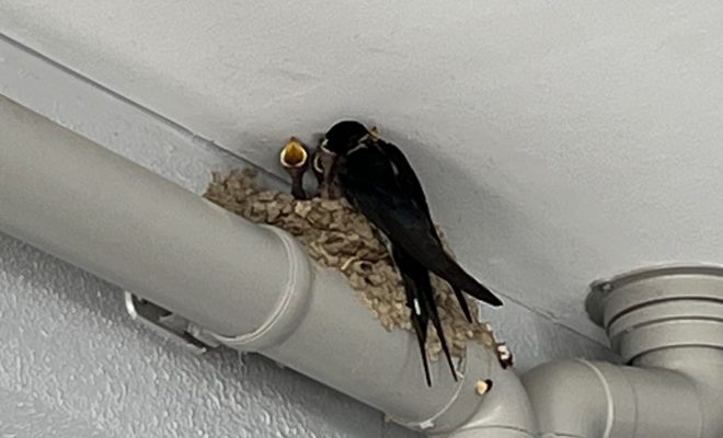 子育ての真っ只中!!コクボモータースの軒下にできたツバメの巣。孵化したヒナたちを発見しました!なんと、4匹の元気なヒナがいるようです。ご飯をねだる姿がとっても可愛いですね。親鳥が巣に戻ると、ヒナたちは一斉に口を開けて、お腹が…